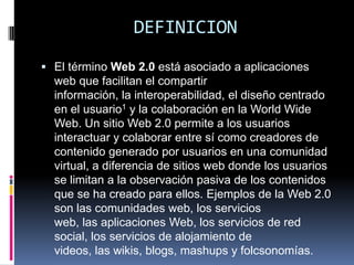 El documento define la Web 2.0 como aplicaciones web que facilitan el compartir información y la colaboración entre usuarios, quienes interactúan como creadores de contenido en lugar de solo observar. Algunas características clave son que la Web es una plataforma, es funcional, simple, ligera, social y participativa. Ejemplos comunes son comunidades web, redes sociales, blogs y wikis.
