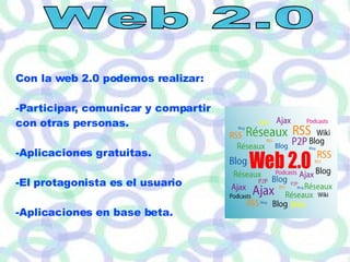 La web 2.0 permite a los usuarios participar, comunicarse y compartir información de forma gratuita. Gracias a las RSS, los usuarios pueden mantenerse al día con la información más reciente de sus sitios favoritos sin necesidad de visitar cada página. Los blogs, wikis y Creative Commons permiten a los usuarios crear y compartir contenido de forma colaborativa.