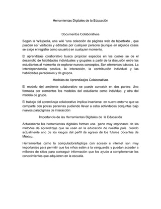 Wikis permiten que cualquier persona edite páginas web de forma colaborativa. El aprendizaje colaborativo fomenta el desarrollo de habilidades individuales y grupales a través de la discusión de nuevos conceptos. Los modelos de aprendizaje colaborativo incluyen elementos del estudiante individual y del grupo. Las herramientas digitales son una parte importante de los métodos de enseñanza en México y permiten a los estudiantes acceder a información que complementa lo aprendido en la escuela.