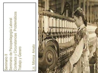 El documento describe las circunstancias problemáticas del trabajo y género en el siglo XIX, incluyendo la pintura "La niña obrera" que muestra la difícil situación de las niñas que trabajaban en las fábricas textiles. También discute las limitadas oportunidades educativas y laborales para las mujeres en esa época, y cómo recién en el siglo XX se lograron avances en la igualdad de género y en los derechos de las mujeres.