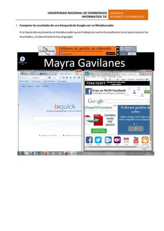 Este documento presenta las actividades realizadas por Mayra Gavilanes, estudiante de Ciencias Sociales de la Universidad Nacional de Chimborazo, como parte de su asignatura de Informática TIC. Las actividades incluyen comparar resultados de búsqueda en Google y metabuscador, consultar impuestos vehiculares, escuchar radios en línea, participar en foros y redes sociales, y utilizar diversas herramientas y servicios de Internet.
