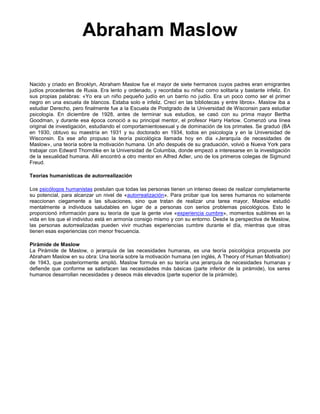 Abraham Maslow fue un psicólogo estadounidense conocido por su teoría de la jerarquía de necesidades. Propuso que los seres humanos están motivados para satisfacer cinco categorías de necesidades: fisiológicas, de seguridad, sociales, de estima y de autorrealización. Según Maslow, una vez satisfechas las necesidades más básicas, las personas se enfocan en satisfacer necesidades de orden superior. Su teoría sugiere que la autorrealización, o el deseo de alcanzar nuestro máximo potencial