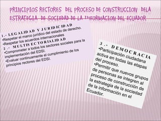 El documento describe 16 principios rectores para la construcción de la estrategia de sociedad de la información en Ecuador. Estos principios incluyen el respeto a la legalidad y los derechos humanos, la participación multisectorial y ciudadana, la transparencia, legitimidad y consenso, la equidad e inclusión, la innovación, la ejecución de acciones concretas, y el uso estratégico y autónomo de las tecnologías de la información y comunicación para impulsar el desarrollo económico y social de manera descentralizada.