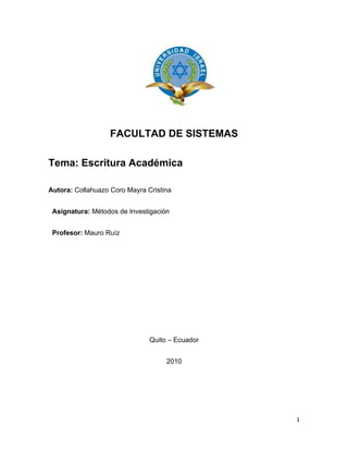 Este documento presenta una introducción al tema de la escritura académica. Explica que la escritura académica es necesaria en las escuelas y universidades. También discute los prejuicios de los docentes hacia los métodos de análisis y cómo esto ha afectado la profundidad de la lectura y escritura de los estudiantes. Finalmente, identifica diferentes tipos de conductas deshonestas como el plagio, la colusión y las acciones improcedentes que pueden ocurrir en el contexto académico.