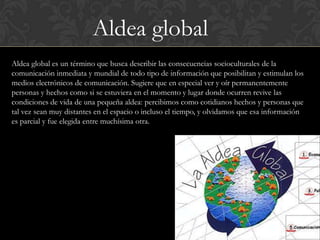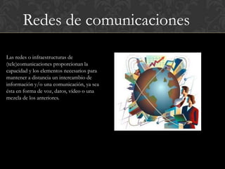 Las redes de comunicaciones permiten el intercambio de información a distancia como voz, datos, video o una combinación. La aldea global describe las consecuencias socioculturales de la comunicación global inmediata que posibilitan los medios electrónicos. El correo electrónico permite enviar y recibir mensajes y archivos rápidamente a través de sistemas de comunicación electrónicos.