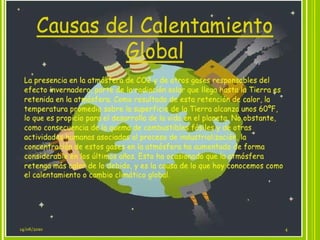 El documento define el desarrollo sostenible como aquel que satisface las necesidades actuales sin comprometer los recursos de las futuras generaciones. Explica que el calentamiento global es causado por el aumento de gases de efecto invernadero como resultado de la actividad humana, lo que está provocando el derretimiento de los hielos y el aumento del nivel del mar. También describe algunas consecuencias como el crecimiento del nivel del agua, el aumento de enfermedades respiratorias y la escasez de alimentos.