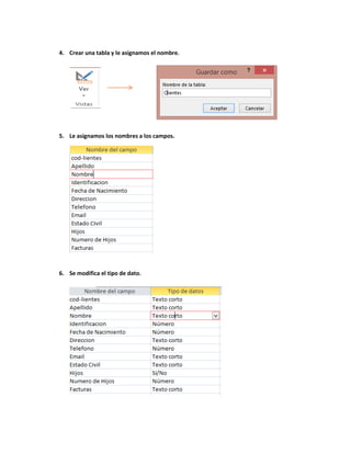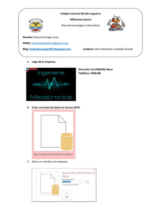 El documento describe los pasos para crear una base de datos en Access 2010, incluyendo darle un nombre a la base de datos, crear una tabla con campos y asignarles tipos de datos, y llenar registros en la vista de hoja de datos. Se proporciona también información de contacto de un estudiante y profesor.