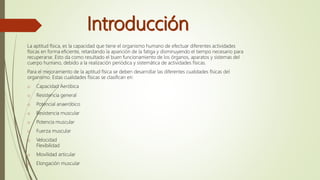 El documento habla sobre diferentes temas relacionados con la aptitud física y el ejercicio. Explica conceptos como la calistenia, que se define como un conjunto de ejercicios centrados en los movimientos musculares más que en la potencia para desarrollar agilidad, fuerza y flexibilidad. También describe la frecuencia cardíaca y diferentes tipos de entrenamiento como el aeróbico, por intervalos y en circuito, destacando sus beneficios para la salud.
