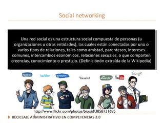 El documento habla sobre el reciclaje administrativo en competencias 2.0 y las redes sociales. Explica brevemente la historia de las redes sociales desde 1997 y los diferentes tipos como las verticales y horizontales. También describe las redes sociales profesionales como Xing, LinkedIn y Ning, que son similares a Facebook pero enfocadas en contactos profesionales y la calidad sobre la cantidad de contactos.
