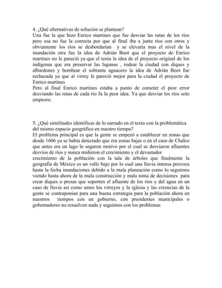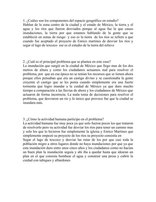 El documento describe la problemática de las inundaciones en la Ciudad de México a lo largo de la historia. Se analizan los componentes geográficos como los ríos y el lago de Texcoco, y cómo la actividad humana como el asentamiento en zonas de riesgo y el desvío de los ríos empeoró el problema. Se discuten varias soluciones propuestas pero ninguna fue efectiva a largo plazo. A pesar del tiempo transcurrido, la mala planificación y toma de decisiones han impedido resolver el problema de las in