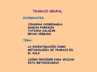 El documento describe un trabajo grupal sobre cómo aplicar la metodología de investigación en el aula. Explica que la investigación puede ser científica pura o aplicada, y que las TIC juegan un rol fundamental en las etapas de la investigación. También señala que al aplicar la metodología por proyectos y problematizar los contenidos, los estudiantes pueden desarrollar habilidades en el uso de las TIC y aprender de manera significativa e integral.