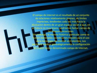 Este documento describe la evolución del campo de Internet en Colombia desde sus inicios en la década de 1980 hasta el año 2000. Explica que inicialmente las universidades, especialmente la Universidad de los Andes, desempeñaron un papel pionero al establecer la conexión a Internet y promover el intercambio de información. En la década de 1990, el Estado colombiano desempeñó un papel central al construir la oferta y demanda de Internet a través de la regulación del sector de telecomunicaciones y la liberalización del mercado.