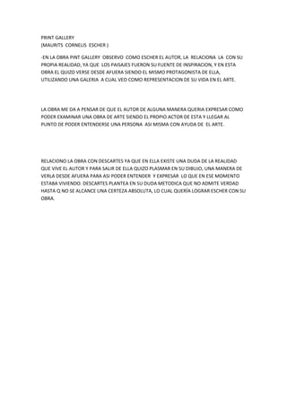 La obra Print Gallery de Maurits Cornelis Escher representa al autor viéndose a sí mismo en una galería de arte, lo que sugiere que quería examinar y entender su propia obra y vida a través del arte. La obra también relaciona la duda sobre la realidad del autor con el método de Descartes de alcanzar certeza absoluta sobre uno mismo, algo que Escher intentó lograr a través de esta representación de sí mismo en su obra de arte.