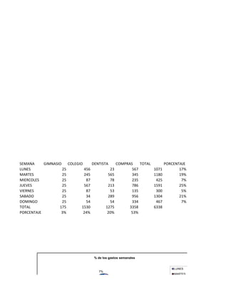 El documento presenta datos estadísticos sobre población, gastos y votación en Argentina. Muestra la población de cuatro países sudamericanos, con Brasil como el más poblado. También detalla la distribución de la población entre tres provincias argentinas, siendo Mendoza la más poblada. Por último, informa sobre los votos obtenidos por partidos políticos en diferentes provincias argentinas, siendo Tucumán la que más votos le dio al partido Justicialista.