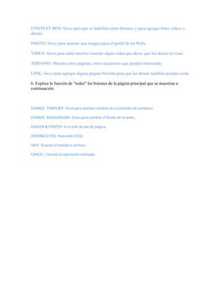 Este documento describe las funciones de los diferentes botones en la página de inicio de Webs.com. Webs.com es un servicio de hosting gratuito que permite a los usuarios crear y alojar sus propias páginas web. El resumen describe brevemente las funciones básicas de los botones de "Manage Pages", "Edit Website", "Modify Template" y "Control Panel" para administrar el sitio, así como los botones para agregar contenido como blogs, fotos, videos y enlaces. También resume las funciones de botones como "Change Template", "Change Background",