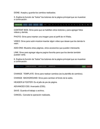 Webs.com es un sitio de hosting gratuito que el autor usó para realizar trabajos prácticos y compartir páginas web. Explica las funciones de varios botones en Webs.com, incluyendo botones para editar páginas, agregar contenido multimedia, personalizar plantillas y guardar cambios.
