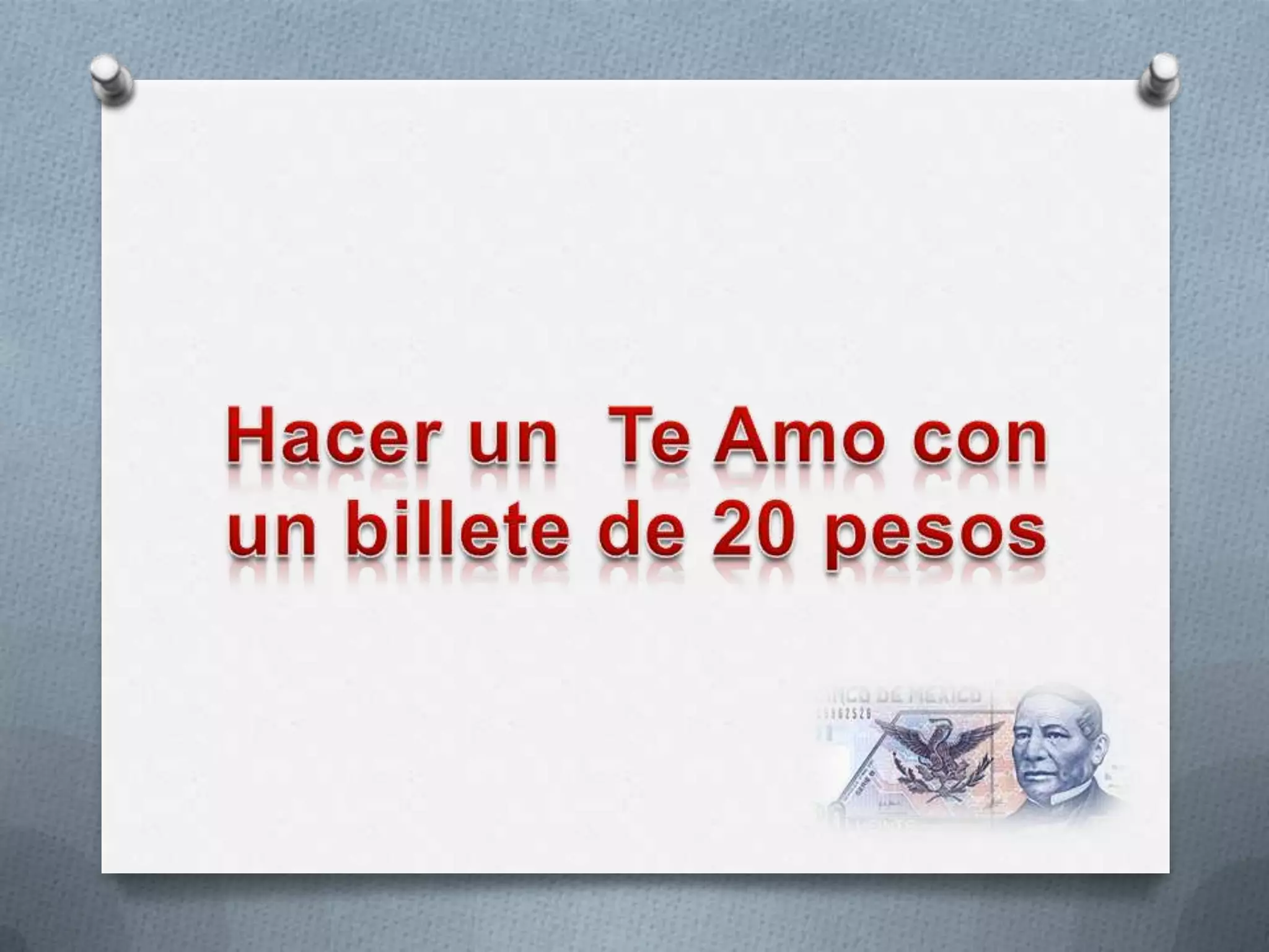 El documento proporciona instrucciones paso a paso para doblar un billete de forma creativa para formar las palabras "AMO" y "VEINTE". Primero se dobla entre las letras B y A a lo ancho del billete, luego se doblan las letras para formar "AMO" y parte de "VEINTE", después se dobla hacia atrás para unir "TE" con "AMO", a continuación se divide el billete en tres partes de arriba hacia abajo, y finalmente se entrelazan las partes dobladas.