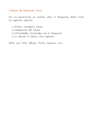 El documento contiene instrucciones para varias presentaciones en cartulina sobre temas de salud y nutrición, incluyendo la dieta mediterránea, el tabaquismo, las bebidas alcohólicas, la columna vertebral, la anorexia nerviosa, la bulimia y la vigorexia. Cada presentación debe cubrir el concepto, causas, prevención y tratamiento del tema, e incluir fotos, dibujos, textos y esquemas.