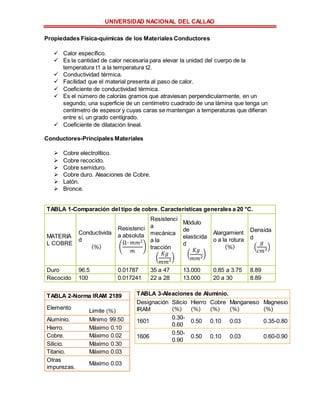 Este documento describe los fundamentos de los materiales conductores y aislantes eléctricos. Explica que los materiales conductores permiten el paso de la electricidad y enumera algunos ejemplos como el cobre y aleaciones de cobre y aluminio. También describe las propiedades eléctricas, mecánicas y físico-químicas de los materiales conductores. Luego, define a los materiales aislantes como sustancias con muy baja conductividad eléctrica y explica sus funciones de aislar conductores y modificar campos eléctric