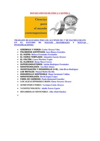 El documento lista los trabajos realizados por estudiantes de primer año de bachillerato en el departamento de física y química sobre nuevos materiales e investigaciones, incluyendo cerámica, vidrio, polímeros sintéticos, acero, vidrio templado, coltán, aluminio, superconductores, nanotecnología, investigación y desarrollo, metales, desarrollo sostenible, fibra de carbono, localización de recursos, semiconductores y más temas relacionados con nuevos materiales.