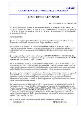 Este documento aprueba el "Reglamento para la Ejecución de Trabajos con Tensión en Instalaciones Eléctricas Mayores a UN KILOVOLT (1 kV)", elaborado por la Asociación Electrotécnica Argentina. Establece la obligatoriedad para los empleadores de capacitar a los trabajadores que realicen trabajos con tensión y poner los planes de capacitación a disposición de las comisiones de higiene y seguridad. Además, complementa, amplía y sustituye las disposiciones vigentes sobre higiene y segur