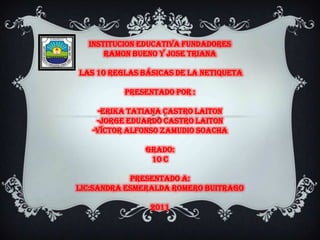 Este documento presenta 10 reglas básicas de la netiqueta. Estas reglas incluyen tratar a otros con respeto en línea, seguir los mismos estándares de comportamiento que en la vida real, conocer las normas de cada sitio web, y respetar el tiempo y ancho de banda de los demás. También recomienda compartir conocimiento, mantener controversias bajo control, respetar la privacidad ajena y no abusar de privilegios en línea. El documento concluye instando a aplicar estas reglas de netiqueta para mejorar