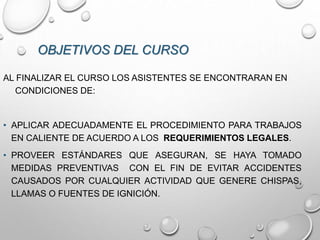 Este documento presenta las reglas y normativas para realizar trabajos en caliente de manera segura. Detalla los objetivos de capacitar a los asistentes en aplicar procedimientos para trabajos en caliente de acuerdo a los requerimientos legales y proveer estándares que aseguren medidas preventivas para evitar accidentes. Además, resume las referencias normativas aplicables, los riesgos asociados a diferentes tipos de trabajos en caliente, y las medidas preventivas que se deben implementar.