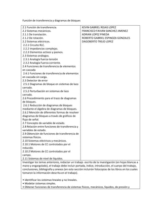 Este documento trata sobre funciones de transferencia y diagramas de bloques. Explica conceptos básicos como funciones de transferencia para sistemas mecánicos y eléctricos. También cubre temas como analogías entre sistemas, funciones de transferencia para elementos en cascada, diagramas de bloques para sistemas de lazo cerrado, y métodos para obtener funciones de transferencia a partir de sistemas físicos como motores eléctricos y sistemas de nivel de líquidos. El documento proporciona una introducción general a estos tem