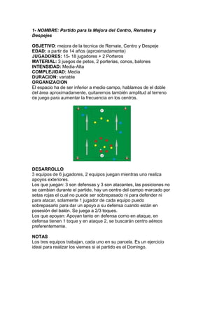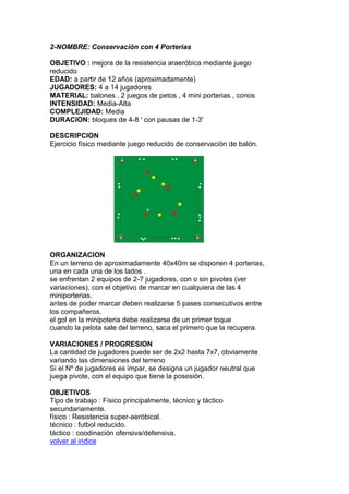 Este documento presenta 8 ejercicios de entrenamiento para mejorar diferentes aspectos técnicos y tácticos del fútbol. El primer ejercicio se enfoca en mejorar los centros, remates y despejes a través de un partido reducido. El segundo ejercicio trabaja la resistencia aeróbica mediante un juego de conservación con 4 porterías. El tercer ejercicio mejora la potencia aeróbica y el pressing a través de un partido donde se ataca en un campo y se defiende en otro.