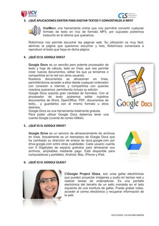 Este documento contiene preguntas y respuestas sobre diversos temas relacionados con las Tecnologías de la Información y la Comunicación (TICs). Se define el software libre, se mencionan aplicaciones para convertir archivos PDF a Word y para convertir textos a archivos MP3. También se explican Google Docs, Google Drive, Google Glass, Sky Drive de Outlook y Office 365. Finalmente, se detallan los pasos para subir un video a YouTube y complementos para descargar videos, se describen redes sociales como Facebook y Twitter, y se define el rol de un