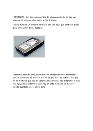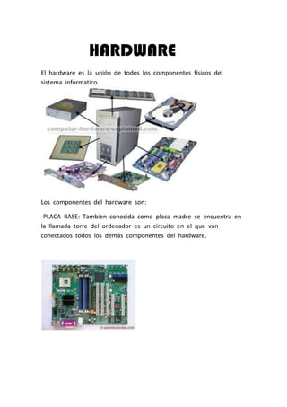 El hardware está compuesto por la placa base, memorias como el disco duro y la RAM, fuente de alimentación, tarjetas (de sonido, wifi, gráfica), unidad de CD/DVD, monitor, teclado, ratón y diferentes conectores (PS2, USB, VGA, LAN, de audio y micrófono). El software incluye programas como procesadores de texto y simuladores que permiten las funciones del ordenador.