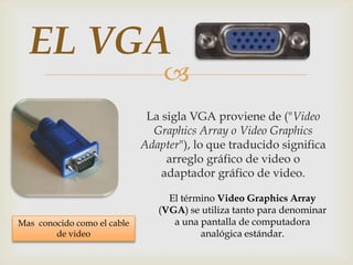 Este documento resume tres tipos de puertos de computadora: VGA, paralelo y serial. VGA se refiere al estándar analógico para la salida de video, paralelo permite enviar bytes completos de datos a la vez, y serial transmite bits de forma secuencial uno a la vez.