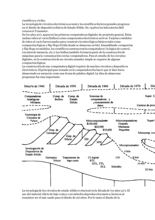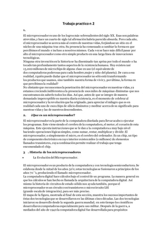 El documento describe la historia y evolución del microprocesador desde su invención en 1971 hasta la actualidad. Explica que el microprocesador comenzó como un circuito integrado simple diseñado para calculadoras pero que ahora se encuentra en el núcleo de la mayoría de las máquinas modernas y ha transformado profundamente la vida humana. También define las partes clave de un microprocesador como la unidad de control, registros, caché y puertos de comunicación, y resume los hitos tecnológicos que llevaron a su cre