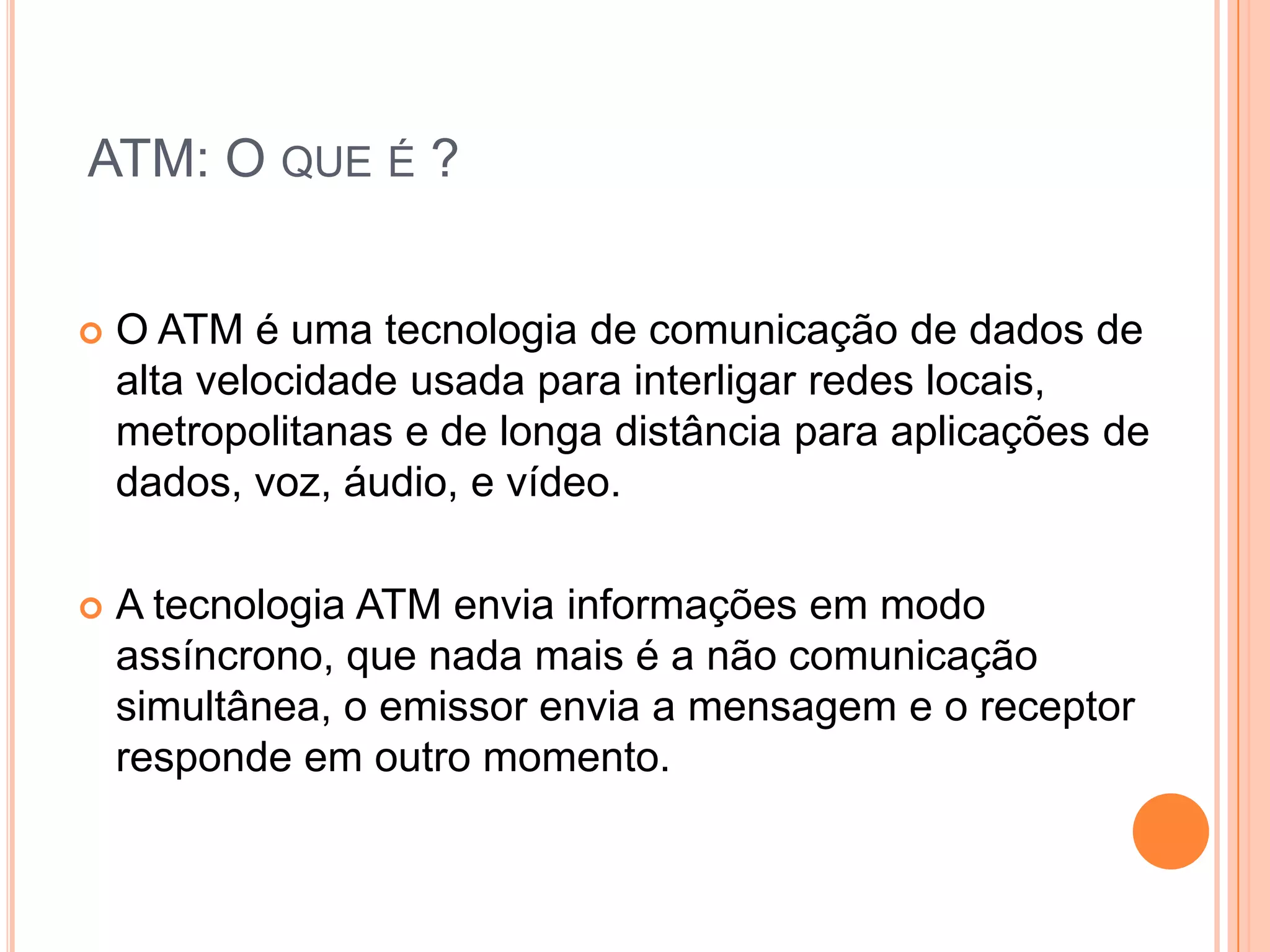 O documento descreve a tecnologia ATM e MPLS. ATM usa comutação de pacotes e conexões virtuais para transmitir dados, voz, vídeo e áudio. MPLS foi criado para melhorar o encaminhamento de pacotes, permitindo rotulá-los para construir caminhos entre roteadores. Ambas as tecnologias permitem transmissão eficiente de múltiplos tipos de aplicações e convergência de redes.