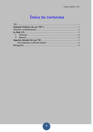 Este documento resume la evolución histórica de las tecnologías de la información y la comunicación (TIC) desde 1958 hasta la actualidad. Detalla hitos como el desarrollo del lenguaje de programación LOGO en 1963 y la creación de ARPANET en 1969, precursor de Internet. También describe brevemente el surgimiento de Internet como red global, el desarrollo de la Web 2.0 y sus características, y los impactos sociales de las TIC en ámbitos como la empresa, la educación y la administración pública.