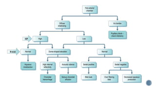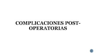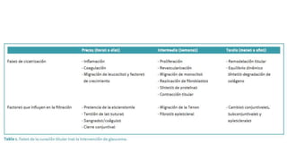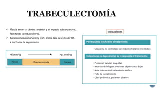 El documento aborda complicaciones y manejo postoperatorio de la cirugía de glaucoma, incluyendo tasas de éxito y factores de riesgo asociados. Detalla problemas como hemorragias supracoroideas, hipotonía, y fallas en la filtración, así como tácticas quirúrgicas y médicas para abordar estas complicaciones. Se enfatiza en la importancia de un manejo cuidadoso y seguimiento para optimizar resultados visuales en pacientes tratados.