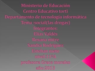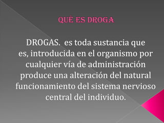 El documento describe los diferentes tipos de tráfico de drogas, incluyendo el tráfico aéreo, marítimo y terrestre. Explica que las drogas son producidas en países de Sudamérica y transportadas de contrabando a países consumidores, y que el tráfico de drogas hacia Estados Unidos ha sido un problema en Panamá desde principios del siglo XX. También detalla los diferentes métodos que usan los traficantes para transportar drogas, como ingerir cápsulas o implantar bolsas de silicona bajo la piel.