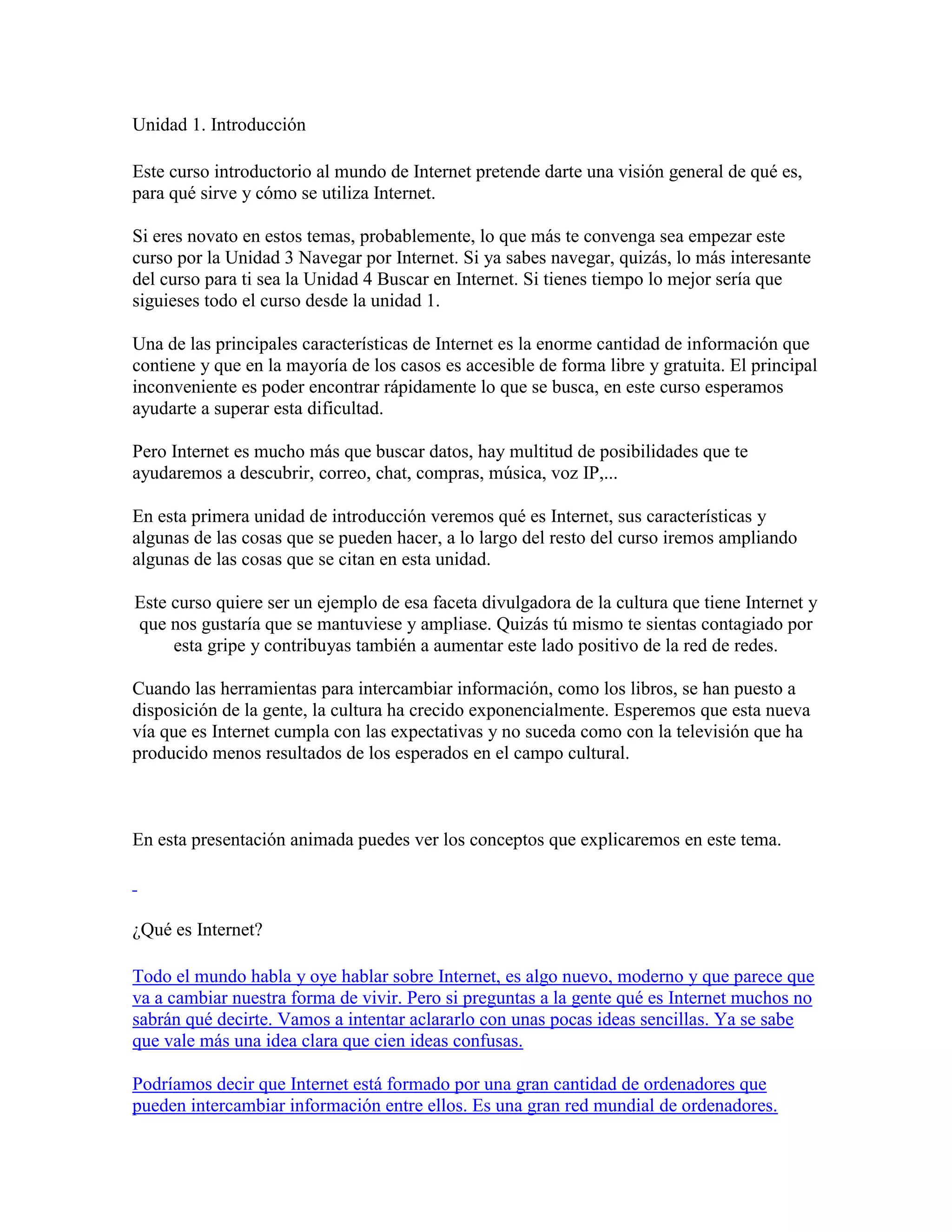 Este documento introduce el curso sobre Internet. Explica que Internet está formado por una red mundial de ordenadores conectados que pueden intercambiar información usando el protocolo TCP/IP. La aparición de la World Wide Web en 1994 facilitó el uso de Internet para todo tipo de usuarios al añadir hipertexto, gráficos y formularios a la red. La información en Internet reside en servidores y puede ser creada por universidades, empresas e incluso usuarios individuales.