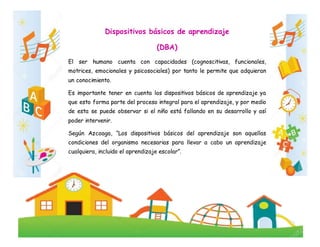 Este documento presenta los dispositivos básicos de aprendizaje (DBA), que son siete procesos cerebrales necesarios para el aprendizaje: percepción, atención, memoria, pensamiento, lenguaje, habituación y motivación. Explica cada uno de estos procesos y su importancia para el aprendizaje de los estudiantes. Además, establece la conexión entre los DBA y los derechos básicos de aprendizaje, señalando que los docentes deben aplicar actividades que involucren los DBA