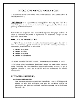 Microsoft PowerPoint es un programa para crear presentaciones que se componen de diapositivas. Las diapositivas permiten insertar texto, imágenes, videos y otros objetos. Es posible animar una presentación mediante efectos de entrada, salida, énfasis y trayectoria. PowerPoint también permite vincular diapositivas para navegar entre ellas y exportar diapositivas a Word.