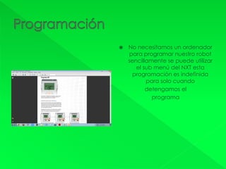 El documento proporciona instrucciones sobre cómo programar y probar diferentes sensores del robot NXT sin necesidad de un ordenador. Explica cómo usar el menú del NXT para probar sensores táctiles, de sonido y luz ambiental, así como recopilar datos sin conexión. También describe cómo configurar la conexión Bluetooth y ajustar parámetros básicos del NXT a través del submenú de configuración.