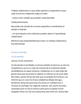 El documento presenta un resumen de las actividades de un grupo de trabajo colaborativo. Asigna roles como vigilante, relator, negociador y líder. Luego discute conceptos como el aprendizaje colaborativo y cooperativo, y cómo aplicarlo en diferentes espacios. Finalmente, incluye un cuento de ficción sobre un grupo que naufraga en una isla misteriosa.