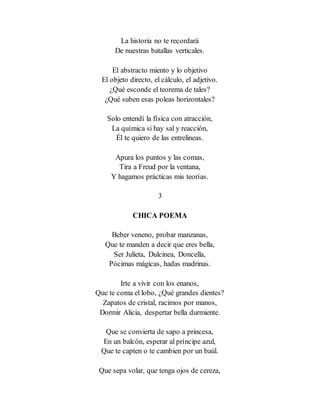 Este poema está compuesto por 22 secciones o estrofas de versos. Explora temas como el amor, la poesía, la lengua y la comunicación. Utiliza juegos de palabras, imágenes y referencias culturales para transmitir estas ideas de una manera creativa y reflexiva.