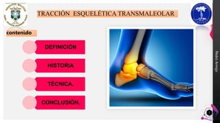 Este documento describe la tracción esquelética transmaleolar, un tipo de tracción que se aplica a través de los maléolos del tobillo. Explica que fue descrita por primera vez en 1895 y que requiere insertar alambres o clavos a través de los maléolos para conectarlos a un sistema de pesas y poleas que ejerce tracción en la pierna inferior. La fuerza debe ajustarse entre el 5-10% del peso corporal y mantenerse hasta lograr la reducción y estabilidad de la fractura, lo que puede tomar semanas.