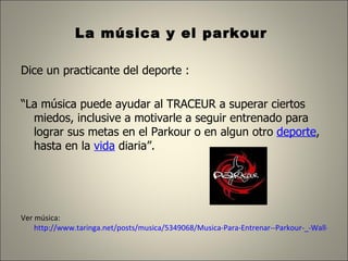 El documento describe la relación entre la música y el parkour. Indica que la música puede motivar a los practicantes de parkour y ayudarlos a superar miedos y entrenar para alcanzar sus metas. También habla de que la música es considerada por los traceurs como un recurso importante para el entrenamiento aunque deben tener cuidado de no distraerse con ella cuando practican en la calle. Finalmente, menciona que videos musicales y presentaciones a menudo incluyen demostraciones de parkour.