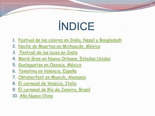 Este documento presenta una lista y breve descripción de 10 festivales y eventos culturales populares de diferentes partes del mundo, incluyendo el Festival de los Colores en India, el Día de Muertos en México, el Festival de las Luces en India, el Mardi Gras en Nueva Orleans, la Guelaguetza en Oaxaca, la Tomatina en España, el Oktoberfest en Alemania, el Carnaval de Venecia, el Carnaval de Río de Janeiro y el Año Nuevo Chino.