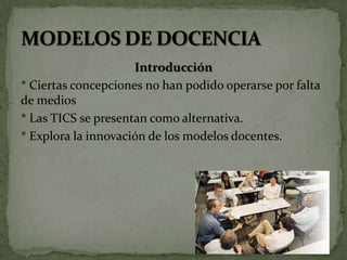 Este documento describe varios modelos didácticos, incluyendo el modelo tradicional, conductista, constructivista, histórico-cultural y tipos alternativos. También discute el uso de aulas virtuales y diferentes métodos de comunicación en la enseñanza en línea.