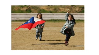 Este documento presenta las tradiciones y costumbres de Chile, incluyendo personajes históricos importantes, juegos típicos y fiestas y bailes folclóricos regionales. Describe varias fiestas religiosas como la Fiesta de la Tirana en Tarapacá, la Fiesta de la Vendimia en el Valle Central, y la Fiesta de la Virgen del Rosario en Andacollo. También menciona la Fiesta de Cuasimodo en Puente Alto. Entre los bailes típicos se encuentran el Sau