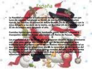 Este documento describe las tradiciones navideñas en varios países europeos. Detalla las costumbres culinarias y decorativas en España, como las reuniones familiares, los turrones y mazapanes. También describe las tradiciones en Alemania de esperar regalos después de la cena, en Bélgica de patinar en ríos helados, y en otros países de colgar banderas en los árboles, encender velas, comer lentejas y usar muérdago. El documento ofrece una visión general de cómo se celebra la Navidad en diversas
