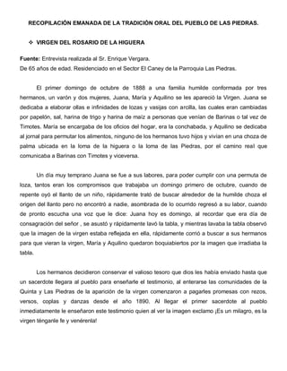 Este documento resume la tradición oral del pueblo de Las Piedras en Venezuela. Narra la aparición de la Virgen del Rosario de la Higuera a una familia humilde en 1888, y cómo desde entonces se le rinde culto en la iglesia del pueblo. También describe las fiestas patronales en honor a la Virgen de la Candelaria cada 2 de febrero, incluyendo procesiones, carreras y música. Relata leyendas locales como el encuentro anual de las bandadas de zamuros tabudares y el misterio detrás de